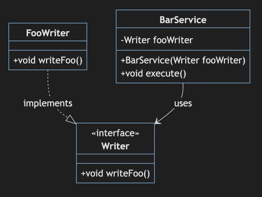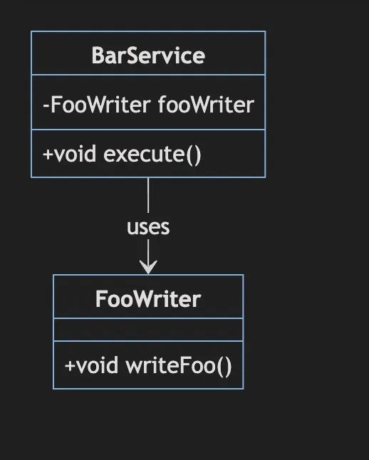 public void excecute() { fooWriter.writeFoo("Bar"); }}上記のような実装方法は、設計上あまりよろしくありません。