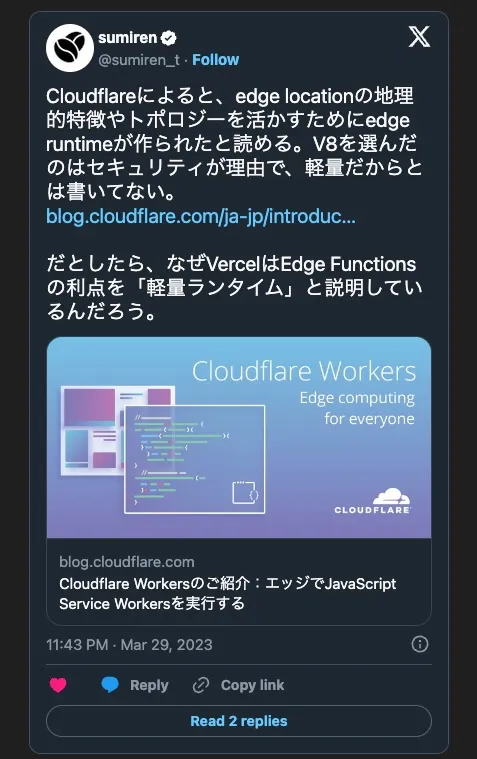 Edge Runtimeは上記のように分離された環境下であるため様々な面で機能が制約されるが、同時に軽量化も維持される。