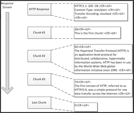 サーバーからクライアントへデータを送信する際に、一括で送るのではなく小分けにして送る方式です。こうすることで、時間のかかるデータの転送を少しずつ行うことができます(具体的には検索結果やライブ配信など、どれくらいの大きさかわからないが巨大なデータ)。