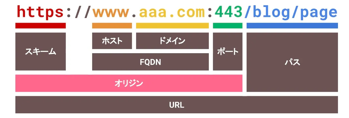 引用の通りですが、URLには「スキーム(プロトコル)」「ホスト(ドメイン)」「ポート」という要素があり、これら3つの組み合わせが**「オリジン」**と呼ばれているようです。
