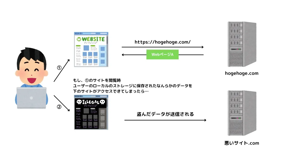 具体的にはWebページなどで、異なるオリジンのリソースにアクセスできないよう制限します。