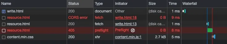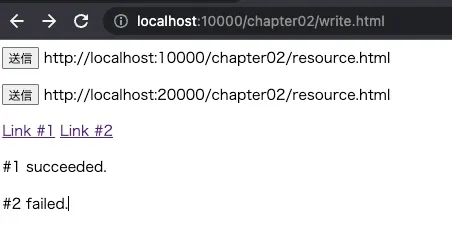 Uncaught DOMException: Blocked a frame with origin "http://localhost:10000" from accessing a cross-origin frame. at http://localhost:10000/chapter02/read.html:4:40また、http://localhost:20000 のリソースがFetch APIなどで取得したデータ(レスポンス)に関しても、http://localhost:10000から読み出したりすることは制限がされます。