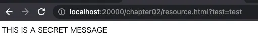 <script> window.addEventListener("load", () => { alert(window.frame01.contentWindow.secret.innerHTML == "THIS IS A SECRET MESSAGE"); alert(window.frame02.contentWindow.secret.innerHTML == "THIS IS A SECRET MESSAGE"); });</script><iframe id="frame01" src="http://localhost:10000/chapter02/resource.html"></iframe><iframe id="frame02" src="http://localhost:20000/chapter02/resource.html"></iframe>http://localhost:10000/chapter02/read.htmlにあるファイルにアクセスした場合。