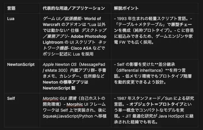 参考までに、JavaScript以外のプロトタイプベース言語での実際の用途や活用例 (ChatGPT o3)