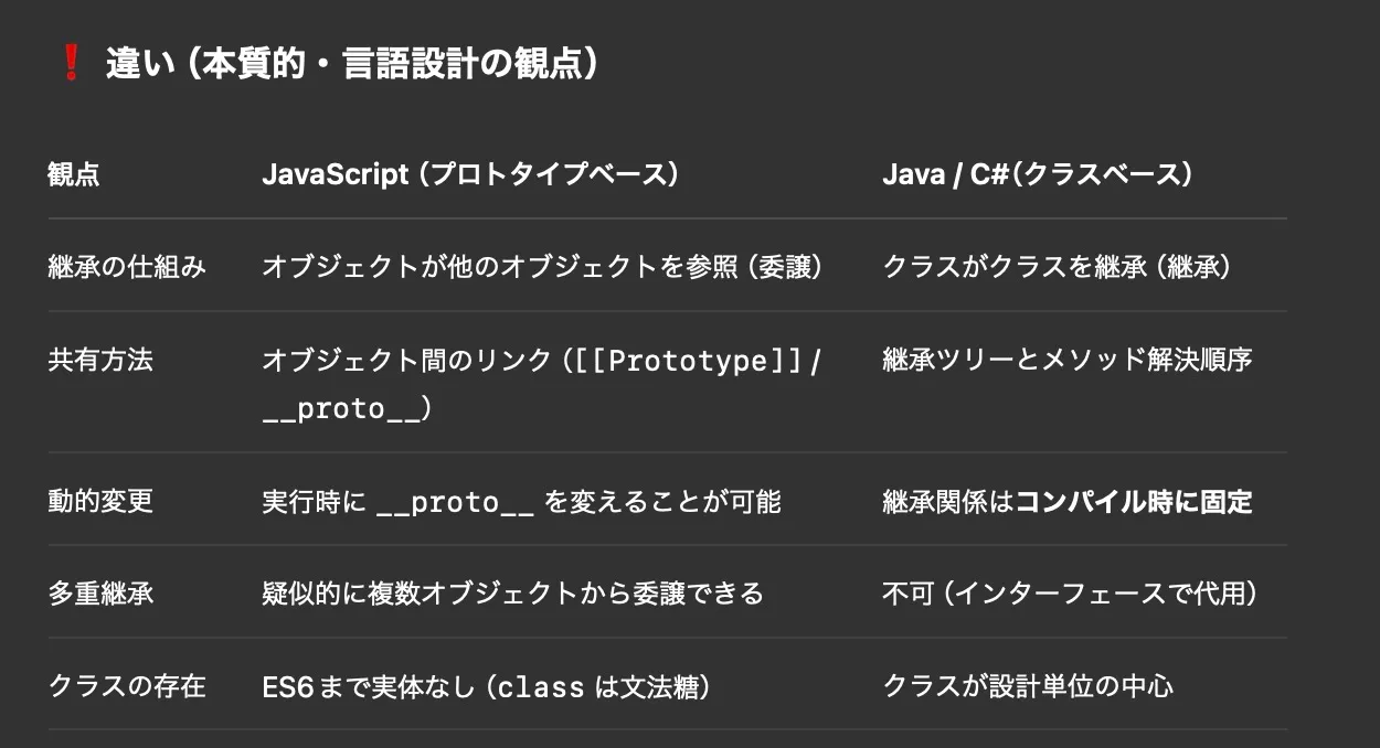 個人的な意見になるが、JavaScriptをプロトタイプベースのOOPと言い切っている人は、プロトタイプベースのOOPがどういったものかを理解していない、もしくはioやSelfのような言語を触ったことがない人だろう。なぜならJavaScriptは何の留保も無しにプロトタイプベースと言い切るにはあまりに奇妙だからだ。何にせよ、ES6からはclass構文が追加されたので、JavaScriptをプロトタイプベースのOOPと言うのはもはや適切ではないだろう。